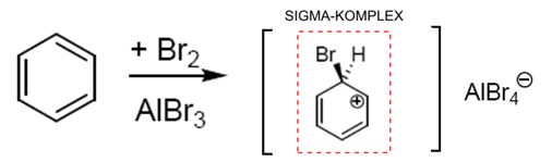 Die Delokalisation der Elektronen führt zur einer Wechselwirkung der Elektronen des Benzols mit dem Elektrophil (Brom) und es bildet sich zunächst ein Pi-Komplex. Die induzierte Polarisierung bewirkt jedoch keine Heterolyse des Br2.