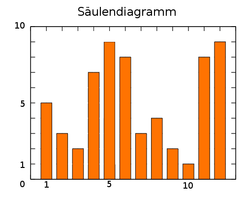 Ein weiteres Merkmal ist die maximale Höhe. Diese muss nicht der maximal mögliche Wert sein, bei Wahlergebnissen etwa $100\%$, sondern sollte nahe des höchsten Wertes liegen. In der Abbildung haben wir also den Wert $10$ gewählt, weil die höchste Säule genau $9$ Felder hoch ist.