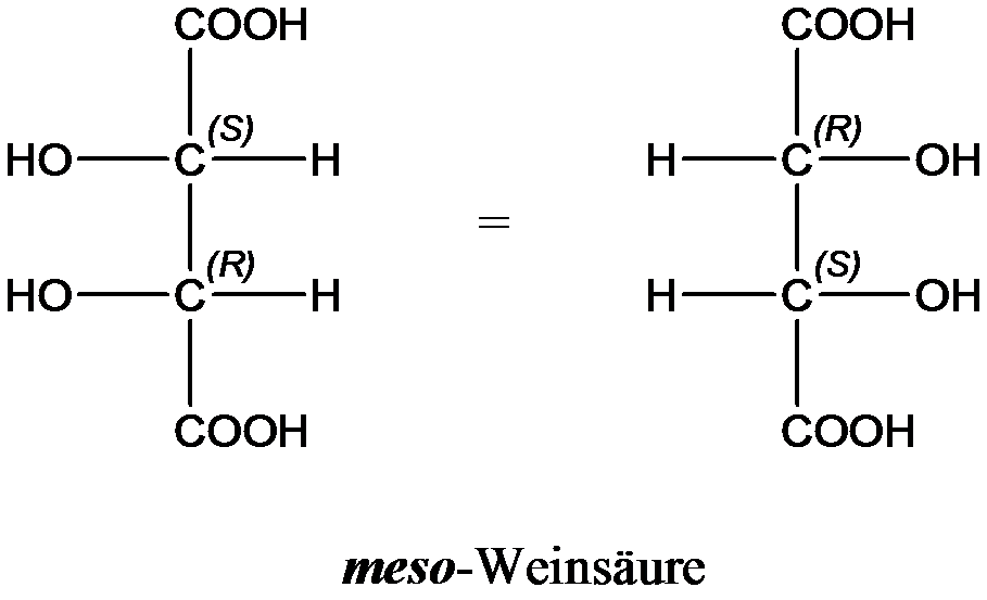 3. sowie die Meso-Form, die nach CIP 2R, 3S oder 2S, 3R genannt werden müsste, aufgrund der Symmetrie sind die beiden Formen hier identisch und daher nicht optisch aktiv!