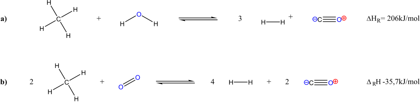 Das Methan (Hauptbestandteil praktisch aller Erdgase) wird mit Wasserdampf umgesetzt (a) oder mit Luftsauerstoff partiell oxidiert (b)
