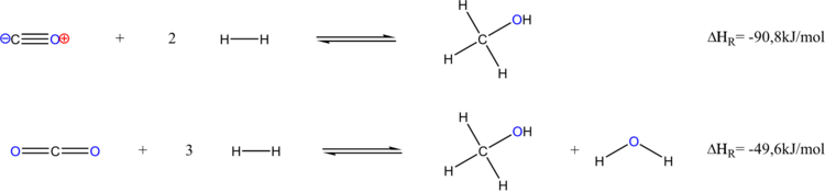 Unter geeigneten Bedingungen lässt sich also sogar Kohlendioxid mit Wasserstoff zu Methanol umsetzen. Da beide Reaktionen exotherm sind und im Volumen auf der Produktseite abnehmen, lässt sich das Gleichgewicht (Le Chatelier) in beiden Fällen durch Kühlung und hohe Drücke nach rechts verschieben.