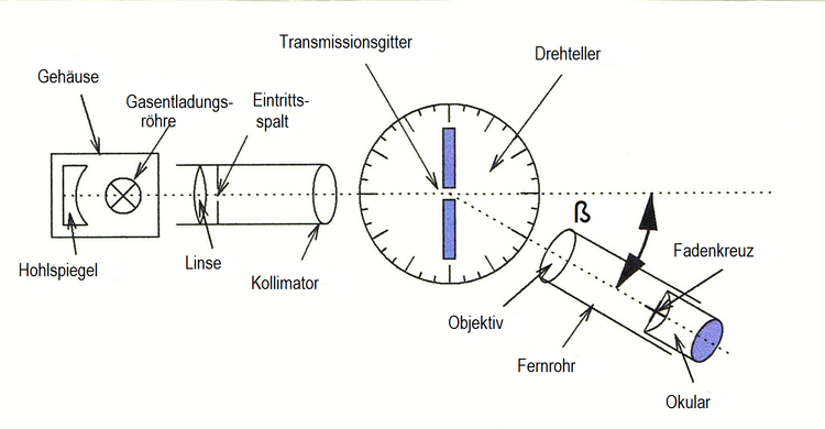 In der Gasentladungsröhre wird Wasserstoff (H) angeregt und das emittierte Licht entsprechend der Anordnung über ein Transmissionsgitter in das Fernrohr geleitet. Zu jeder auftretenden bzw. beobachteten Linie lässt sich über die Markierungen am Drehteller der Winkel $\beta$ ablesen.